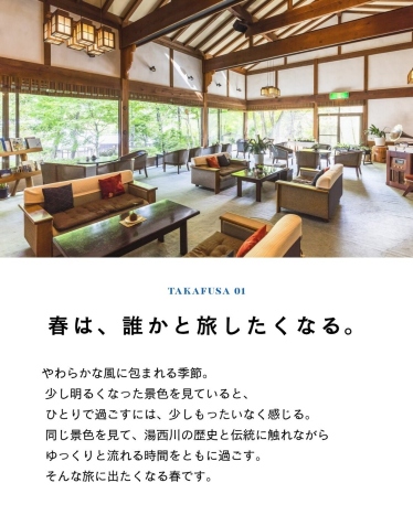 春になると、なぜか誰かと旅がしたくなる。やわらかな風、少し明るくなった景色、新しい季節のはじまり。同じ景色を見て、同じ食事を楽しみ、同じ時間をゆっくり過ごす。そんな何気ないひとときが、きっと大切な思い出になります。この春、大切な人と湯西川へ。