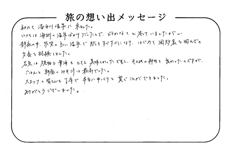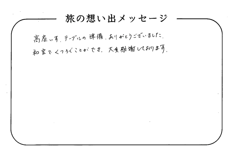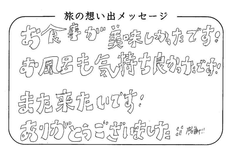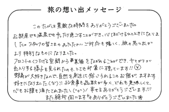 平の高房にご宿泊いただいたお客さまからの声をご紹介。 みなさまから届いた暖かいお言葉やご意見・ご感想を真摯に受け止め、より良いおもてなしの心を育ててまいります。