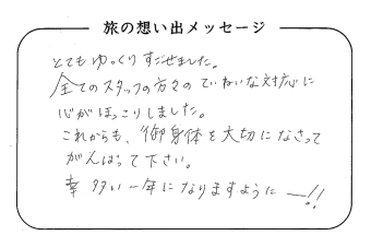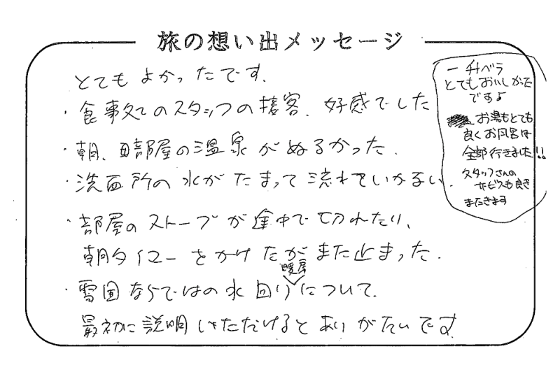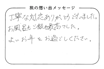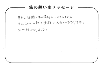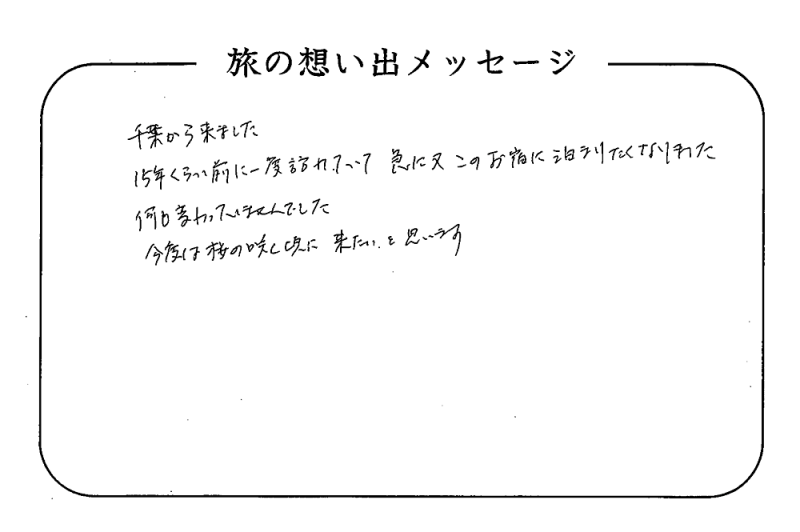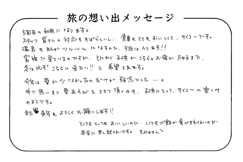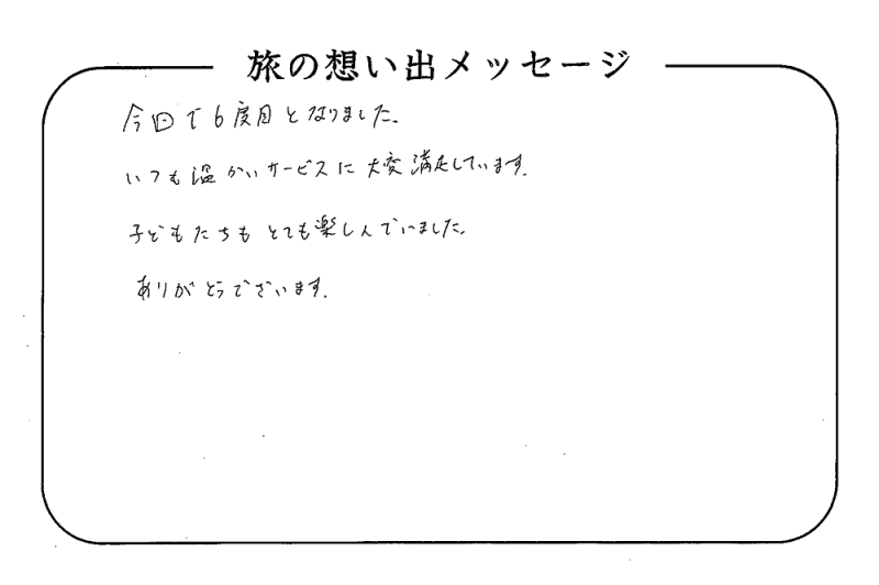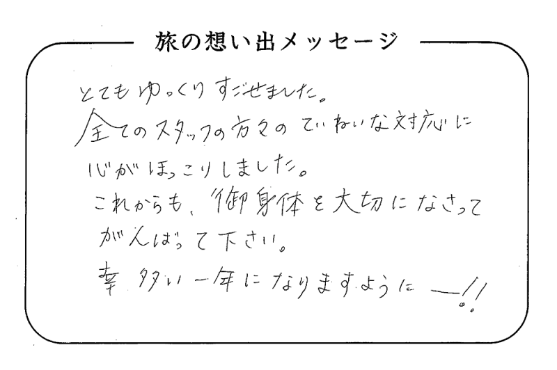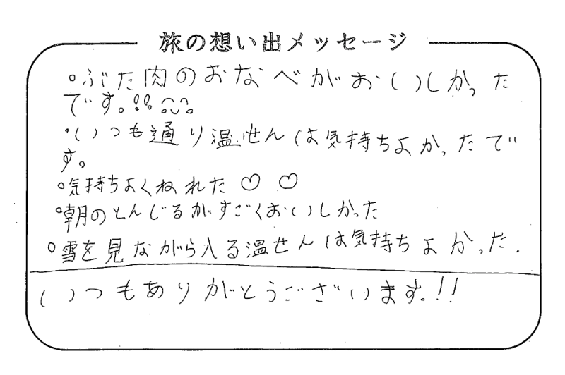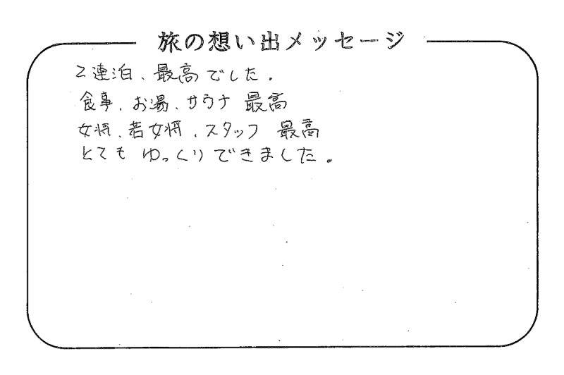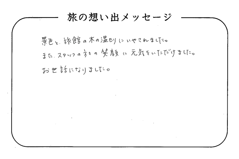 平の高房にご宿泊いただいたお客さまからの声をご紹介。 みなさまから届いた暖かいお言葉やご意見・ご感想を真摯に受け止め、より良いおもてなしの心を育ててまいります。