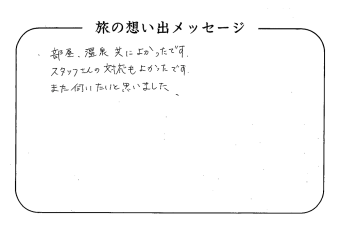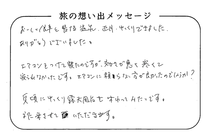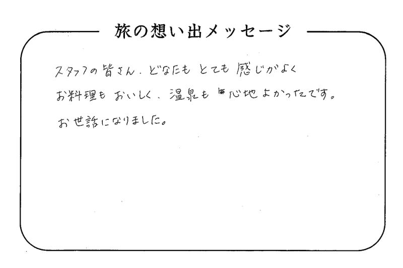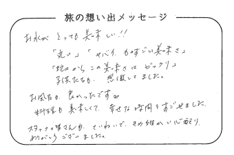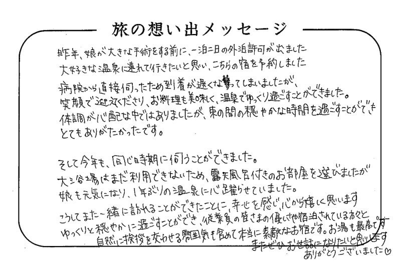 平の高房にご宿泊いただいたお客さまからの声をご紹介。 みなさまから届いた暖かいお言葉やご意見・ご感想を真摯に受け止め、より良いおもてなしの心を育ててまいります。