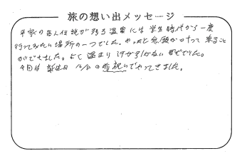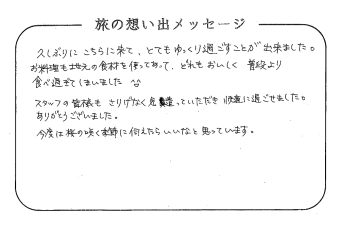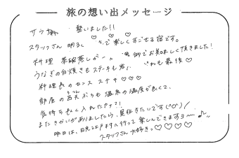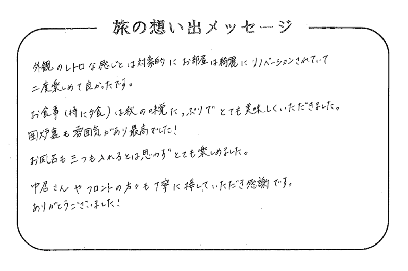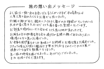 平の高房にご宿泊いただいたお客さまからの声をご紹介。 みなさまから届いた暖かいお言葉やご意見・ご感想を真摯に受け止め、より良いおもてなしの心を育ててまいります。