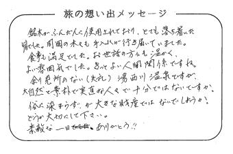 平の高房にご宿泊いただいたお客さまからの声をご紹介。 みなさまから届いた暖かいお言葉やご意見・ご感想を真摯に受け止め、より良いおもてなしの心を育ててまいります。