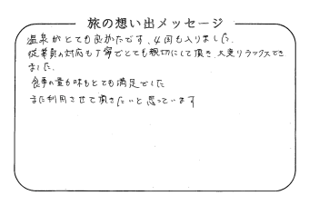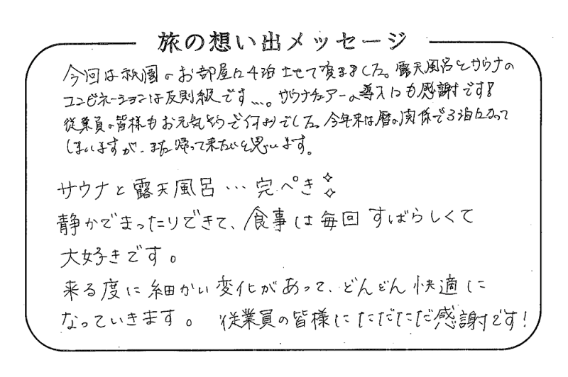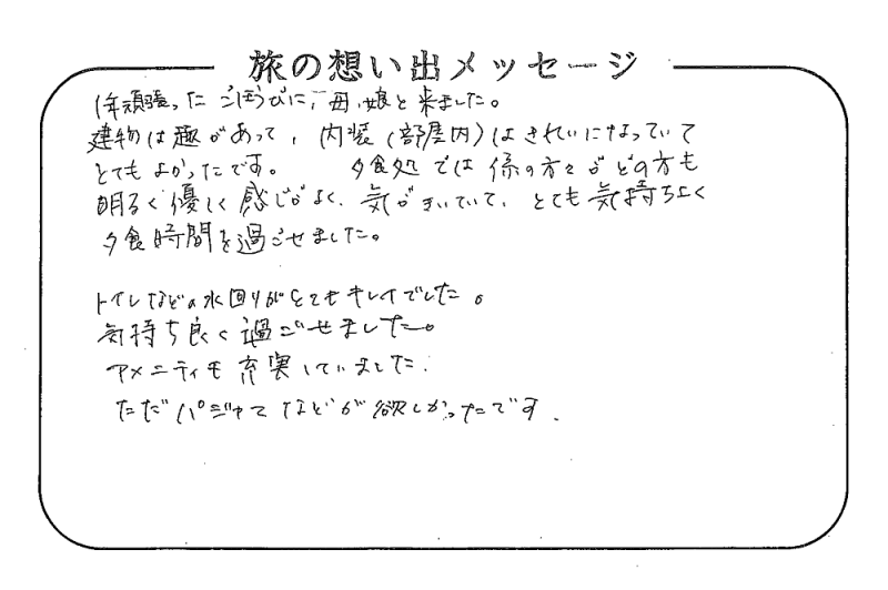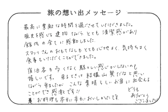 平の高房にご宿泊いただいたお客さまからの声をご紹介。 みなさまから届いた暖かいお言葉やご意見・ご感想を真摯に受け止め、より良いおもてなしの心を育ててまいります。