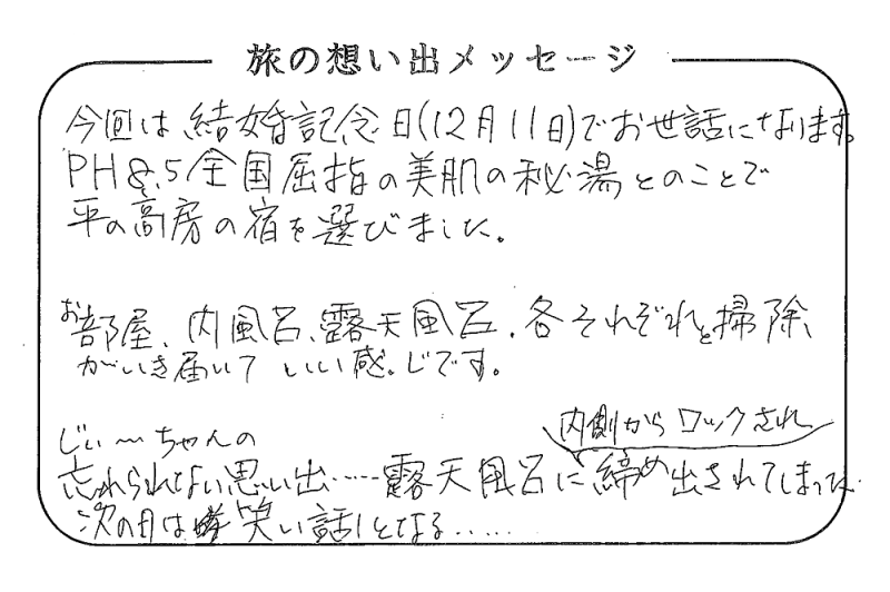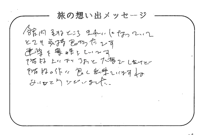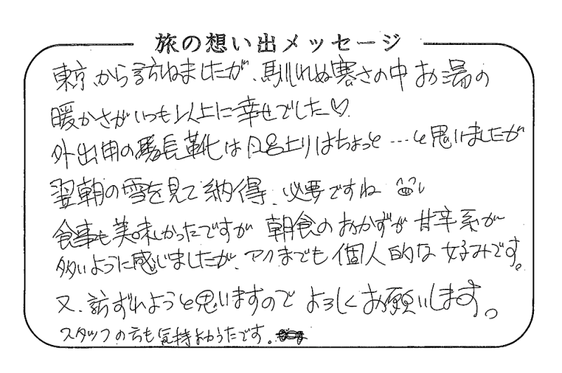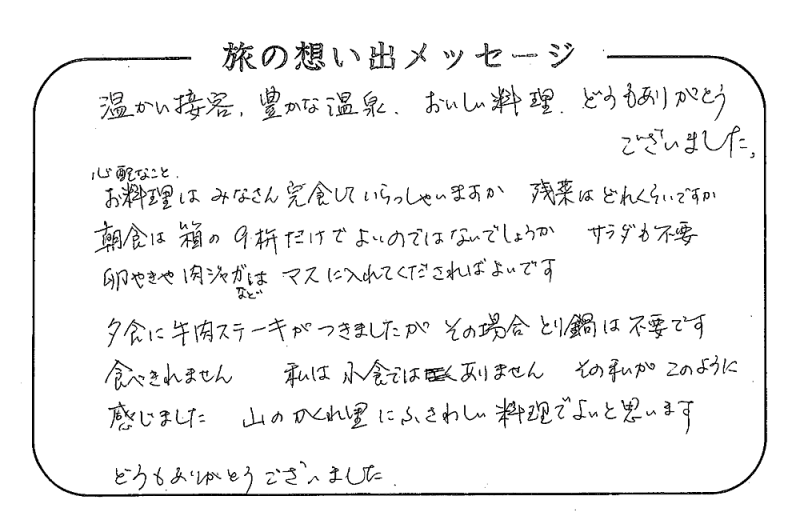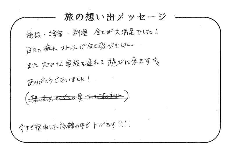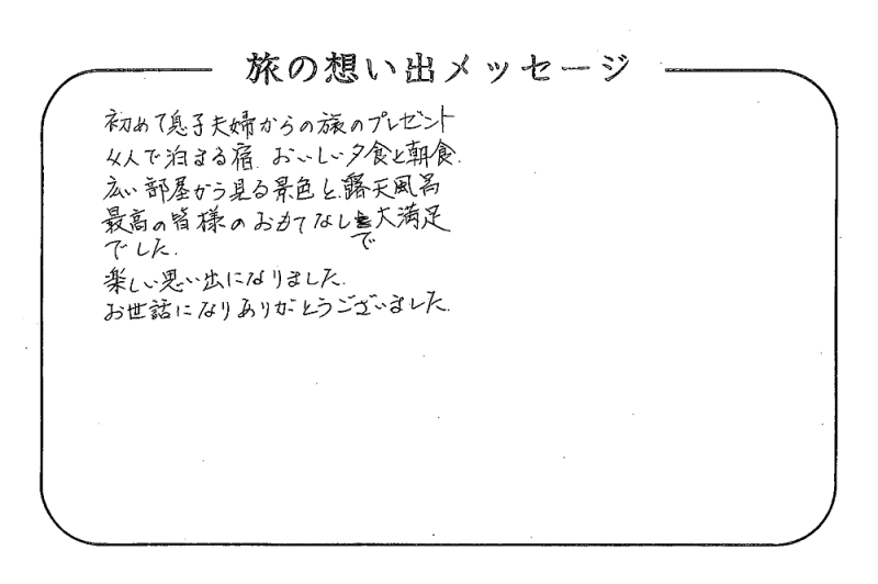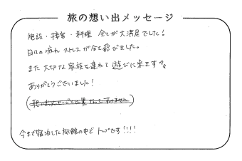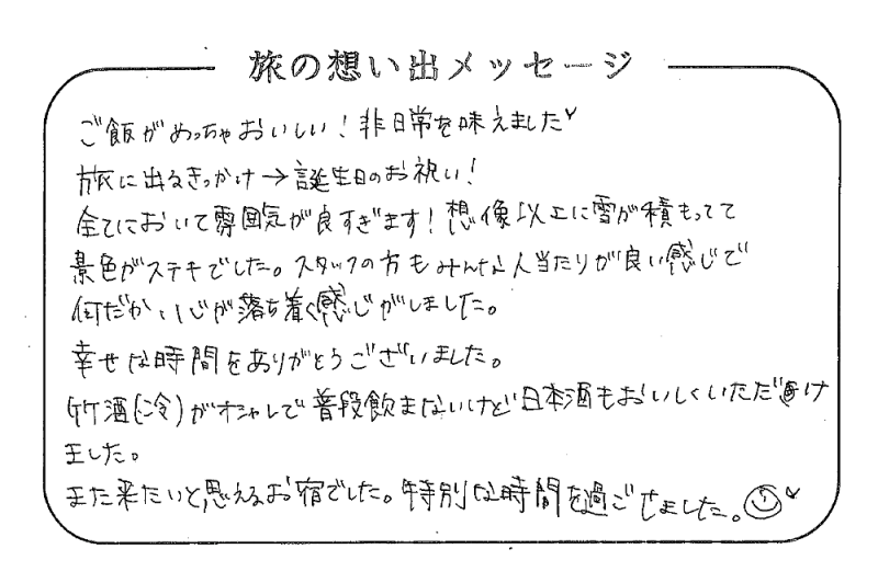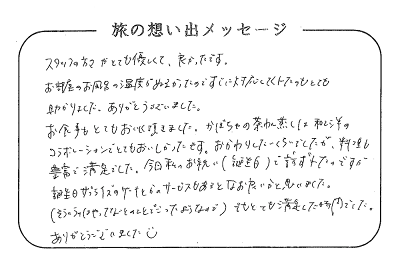 平の高房にご宿泊いただいたお客さまからの声をご紹介。 みなさまから届いた暖かいお言葉やご意見・ご感想を真摯に受け止め、より良いおもてなしの心を育ててまいります。
