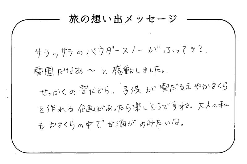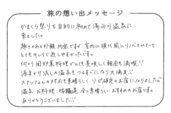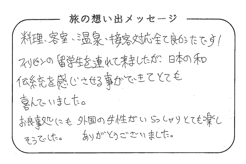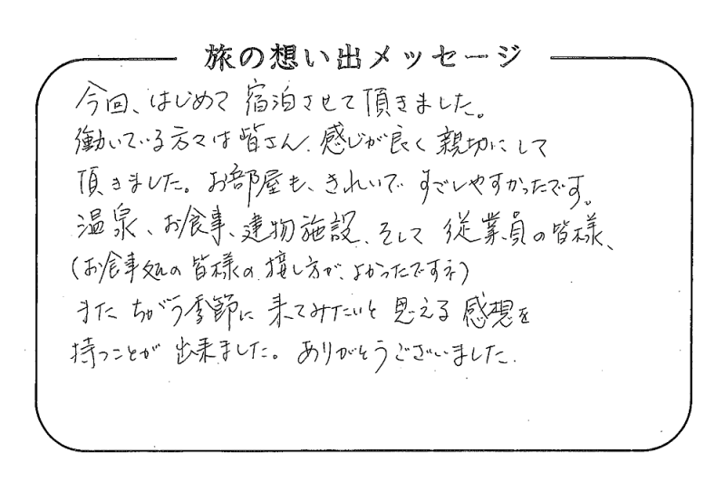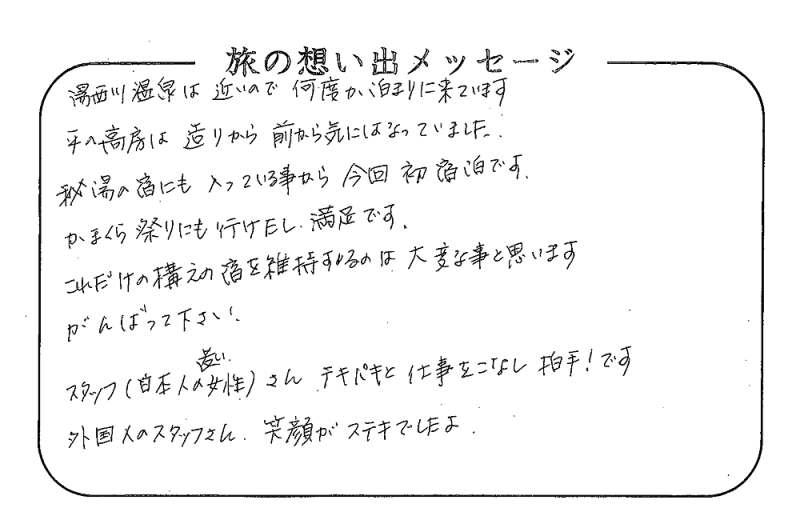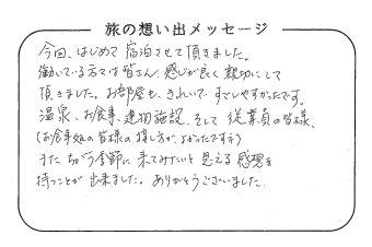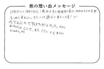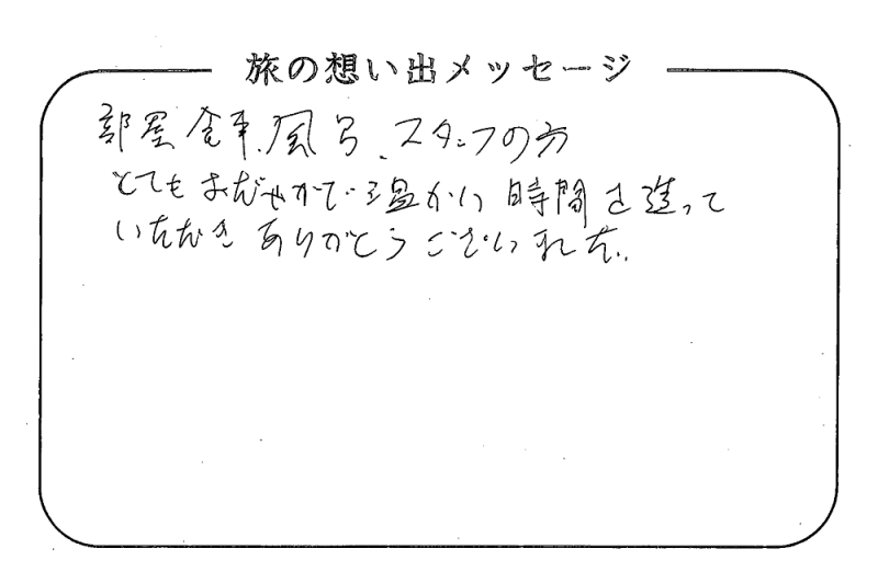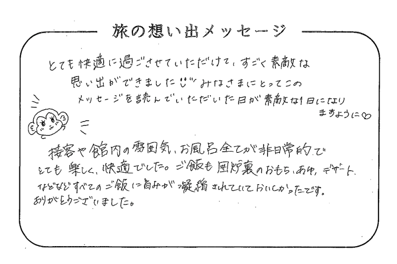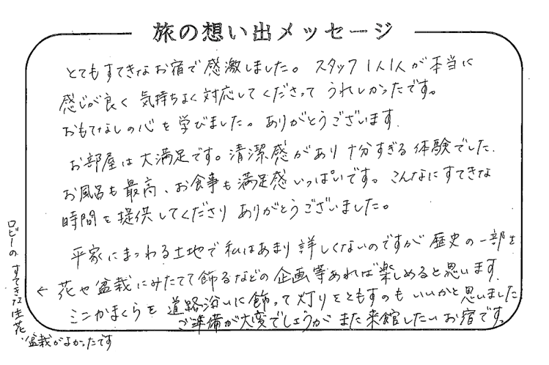 平の高房にご宿泊いただいたお客さまからの声をご紹介。 みなさまから届いた暖かいお言葉やご意見・ご感想を真摯に受け止め、より良いおもてなしの心を育ててまいります。