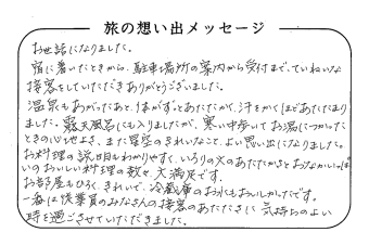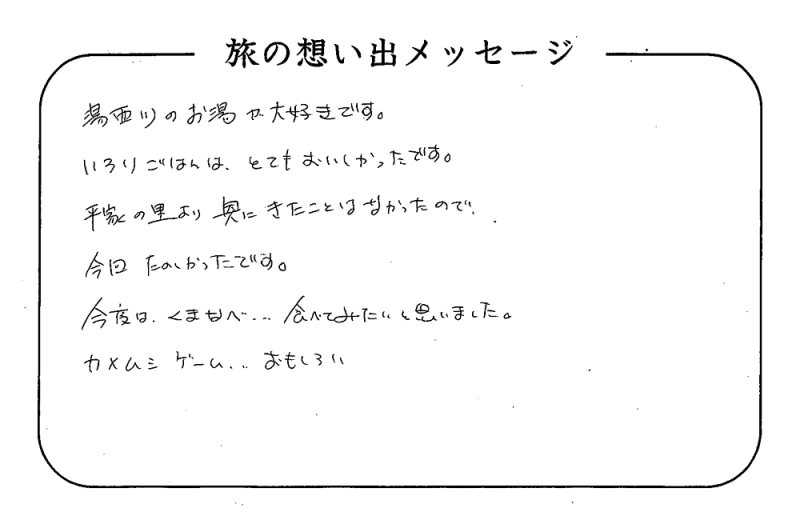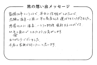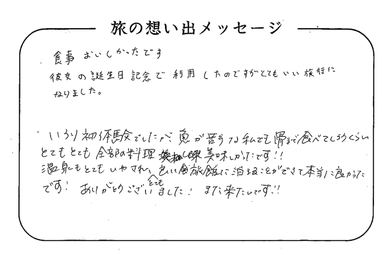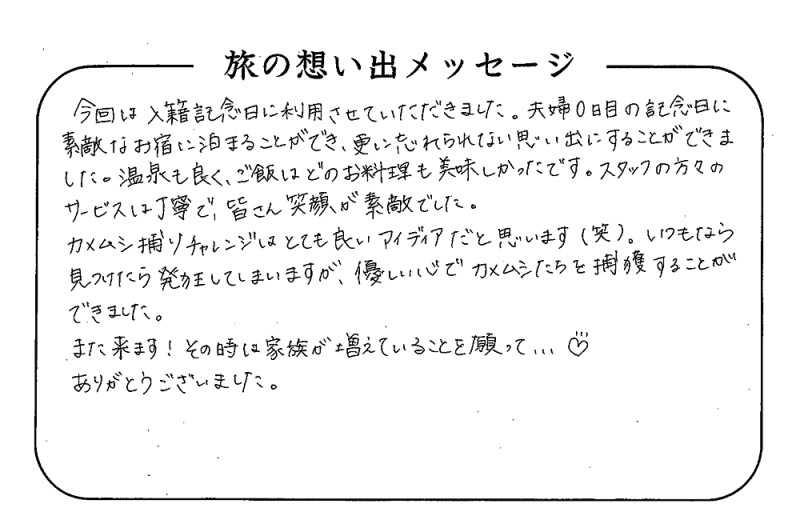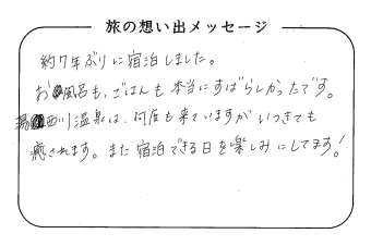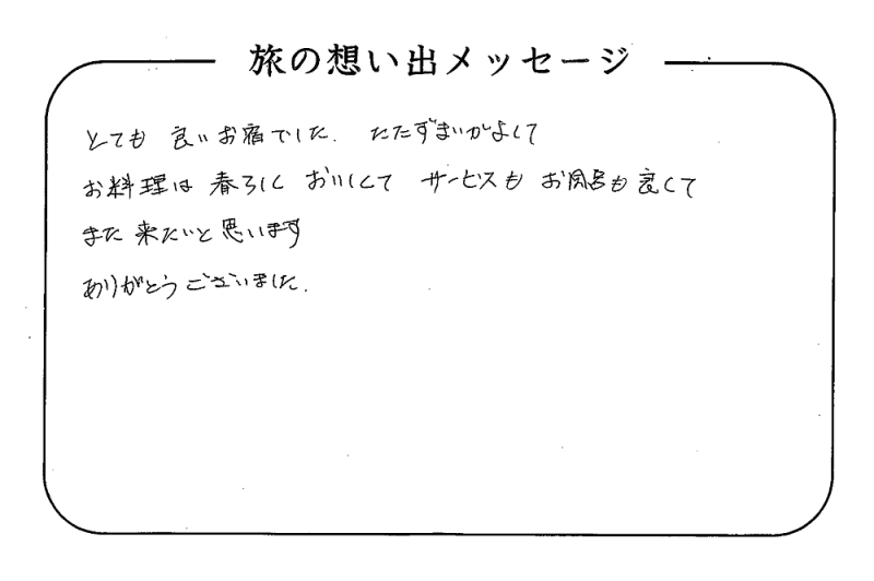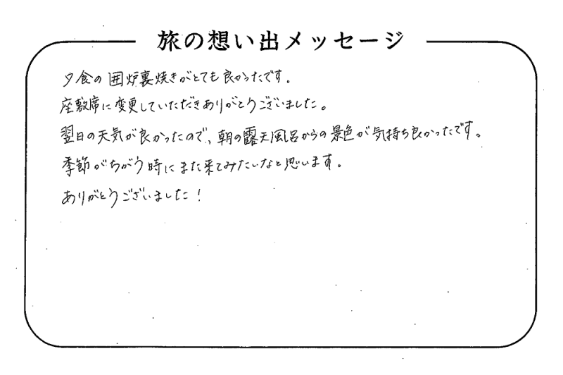 平の高房にご宿泊いただいたお客さまからの声をご紹介。 みなさまから届いた暖かいお言葉やご意見・ご感想を真摯に受け止め、より良いおもてなしの心を育ててまいります。