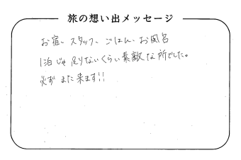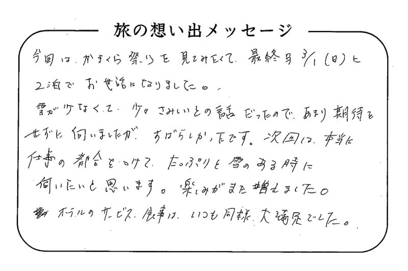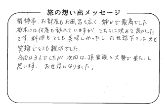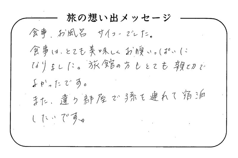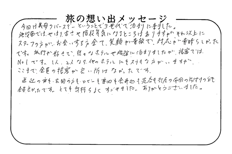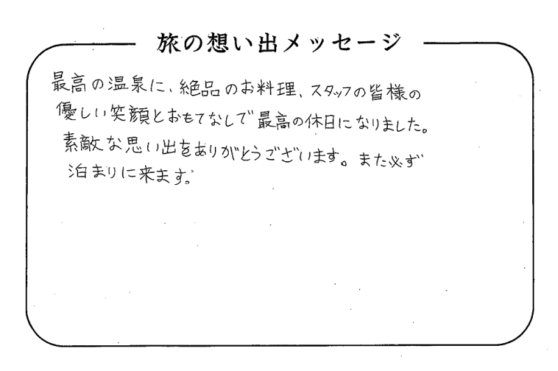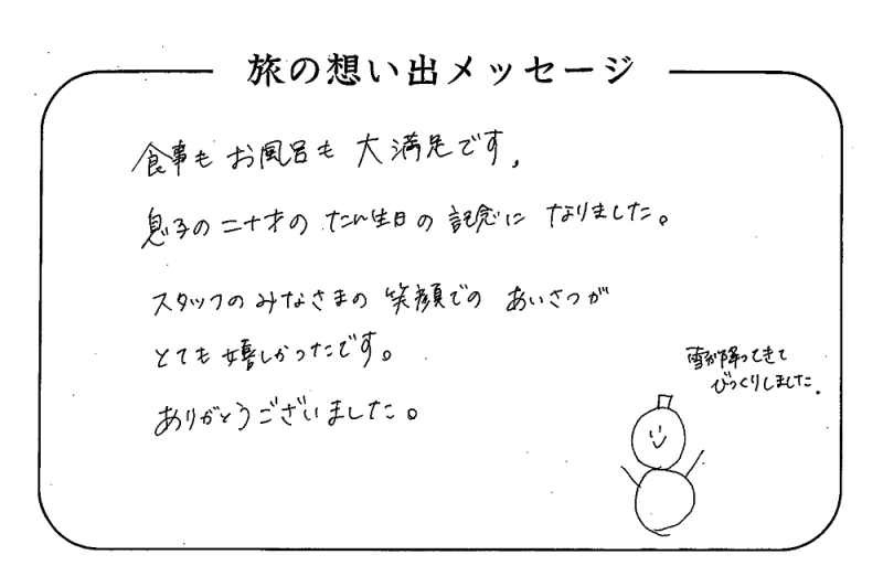 平の高房にご宿泊いただいたお客さまからの声をご紹介。 みなさまから届いた暖かいお言葉やご意見・ご感想を真摯に受け止め、より良いおもてなしの心を育ててまいります。
