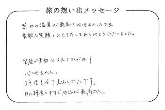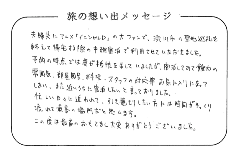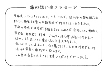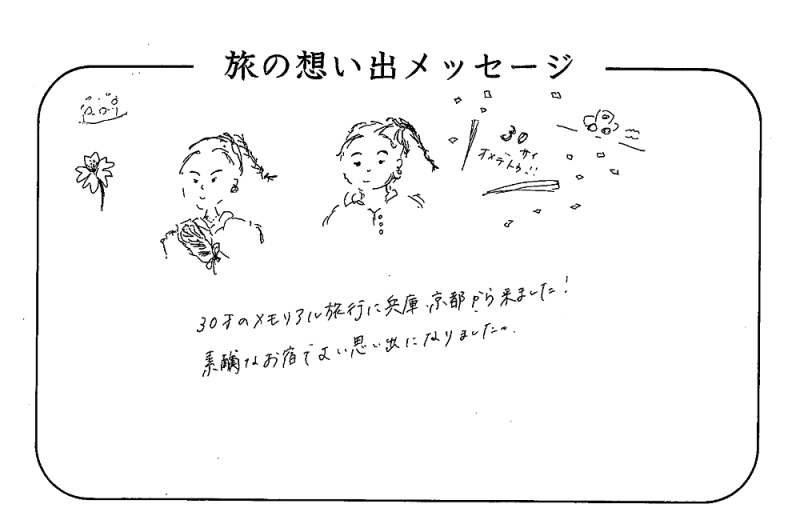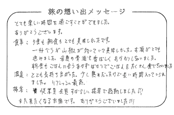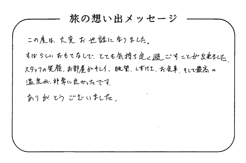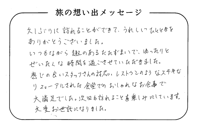平の高房にご宿泊いただいたお客さまからの声をご紹介。 みなさまから届いた暖かいお言葉やご意見・ご感想を真摯に受け止め、より良いおもてなしの心を育ててまいります。