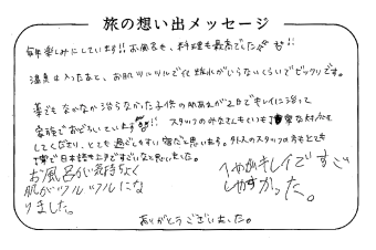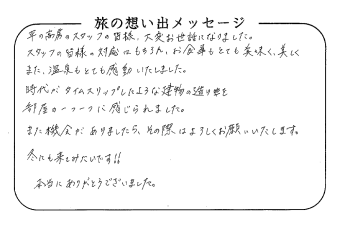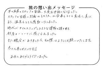 平の高房にご宿泊いただいたお客さまからの声をご紹介。 みなさまから届いた暖かいお言葉やご意見・ご感想を真摯に受け止め、より良いおもてなしの心を育ててまいります。