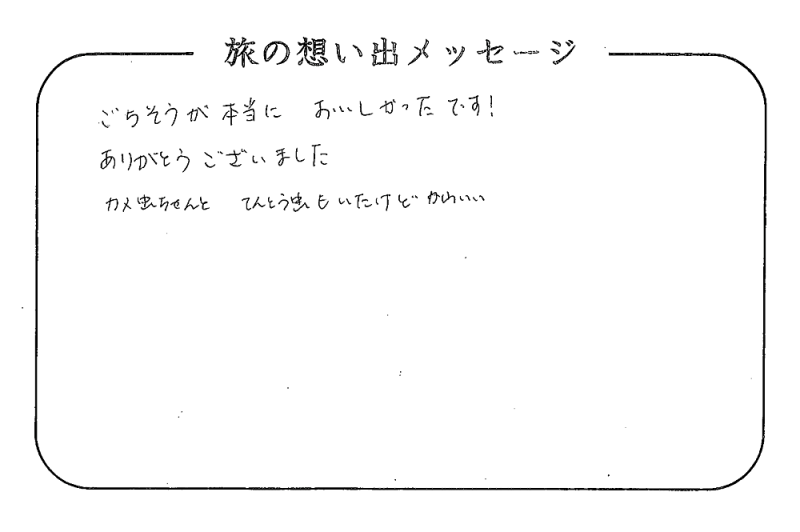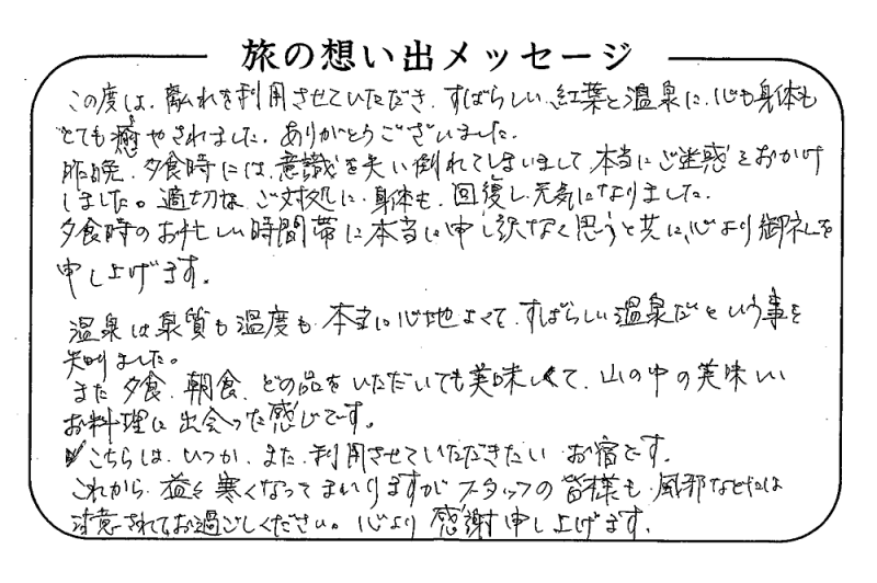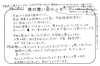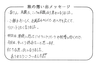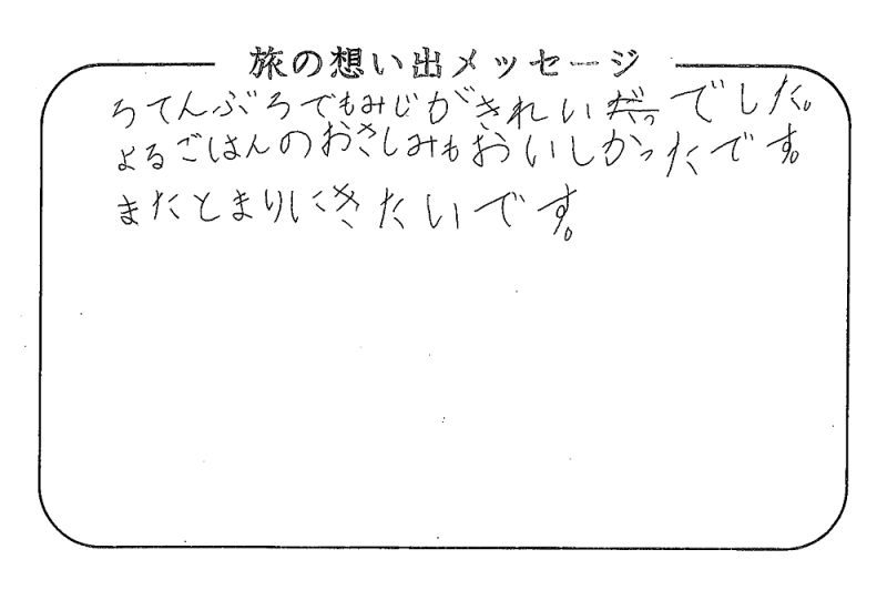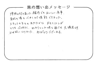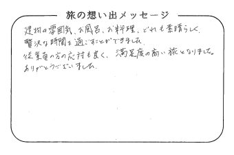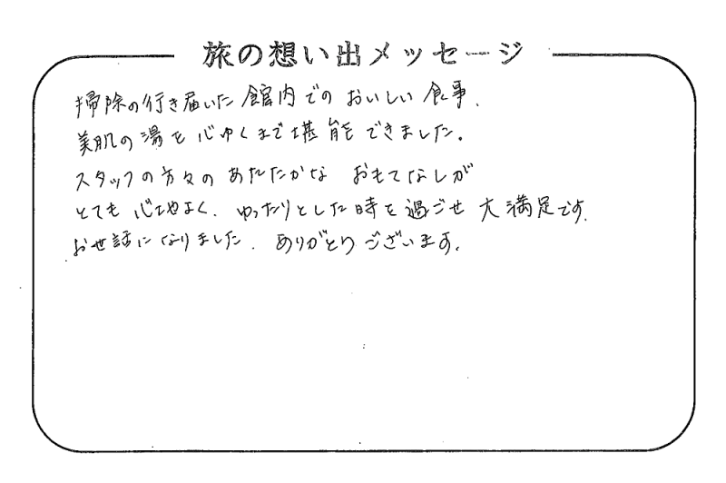 平の高房にご宿泊いただいたお客さまからの声をご紹介。 みなさまから届いた暖かいお言葉やご意見・ご感想を真摯に受け止め、より良いおもてなしの心を育ててまいります。