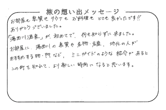 平の高房にご宿泊いただいたお客さまからの声をご紹介。 みなさまから届いた暖かいお言葉やご意見・ご感想を真摯に受け止め、より良いおもてなしの心を育ててまいります。