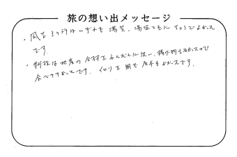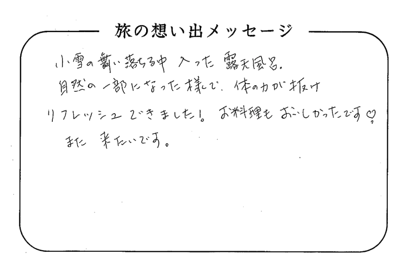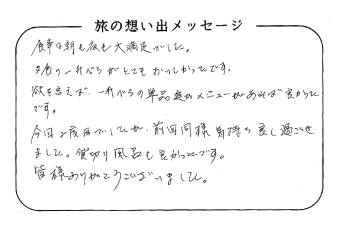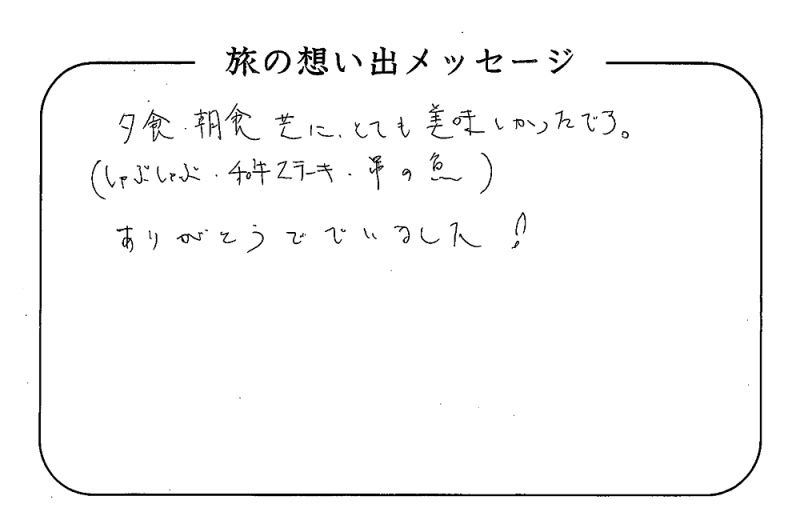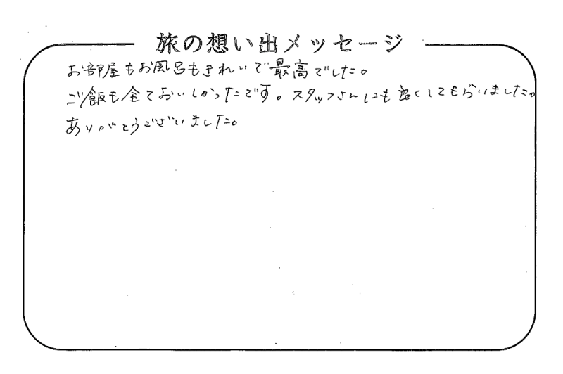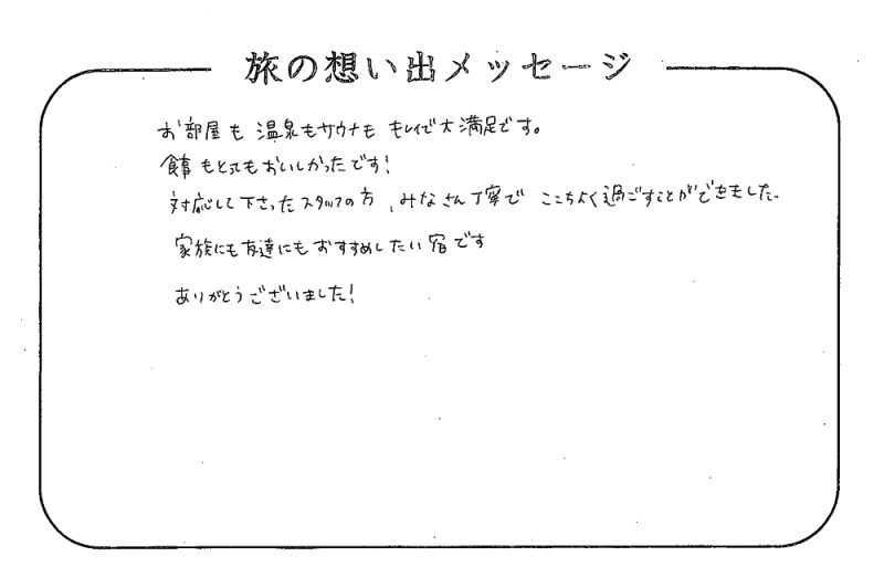 平の高房にご宿泊いただいたお客さまからの声をご紹介。 みなさまから届いた暖かいお言葉やご意見・ご感想を真摯に受け止め、より良いおもてなしの心を育ててまいります。