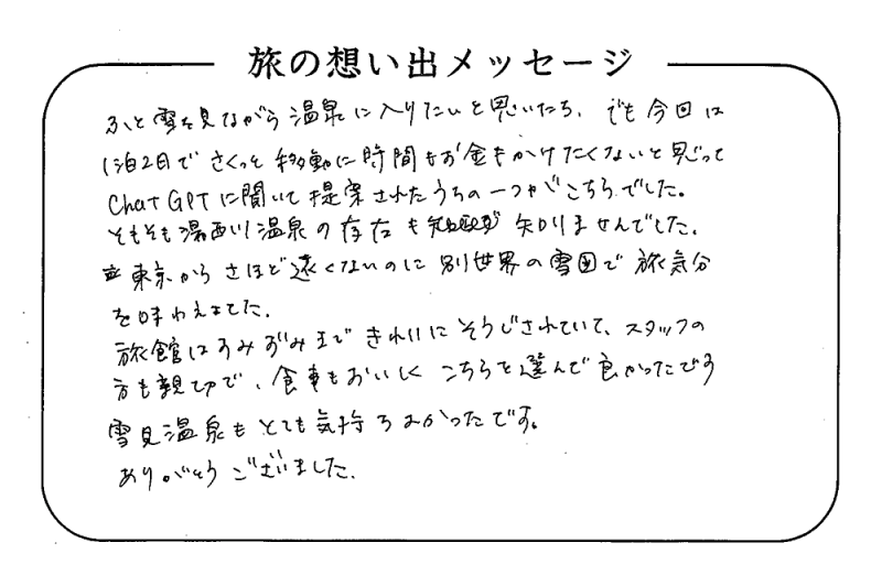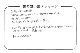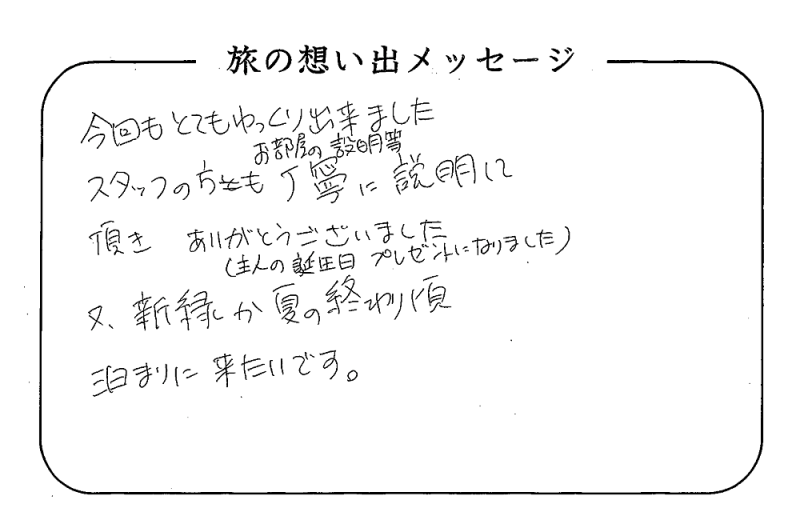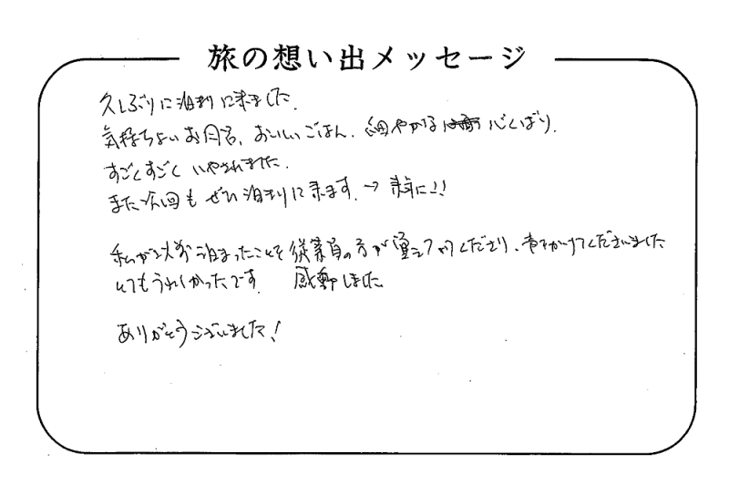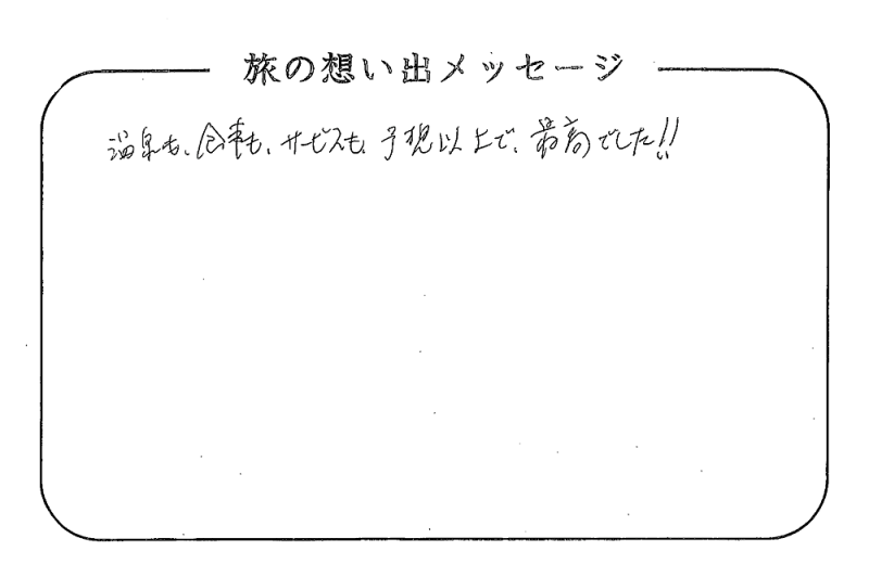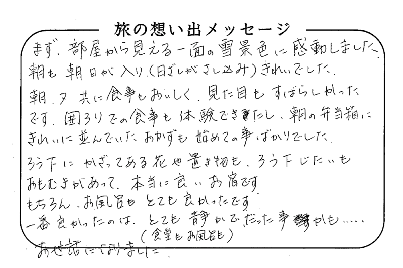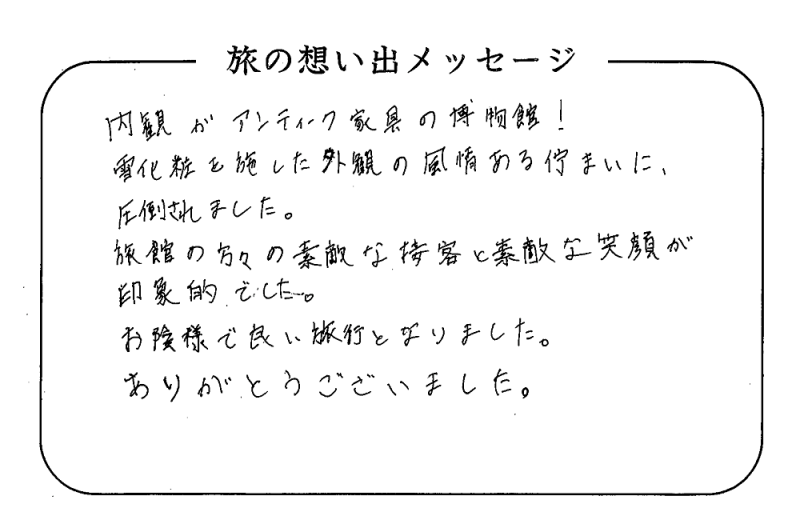 平の高房にご宿泊いただいたお客さまからの声をご紹介。 みなさまから届いた暖かいお言葉やご意見・ご感想を真摯に受け止め、より良いおもてなしの心を育ててまいります。